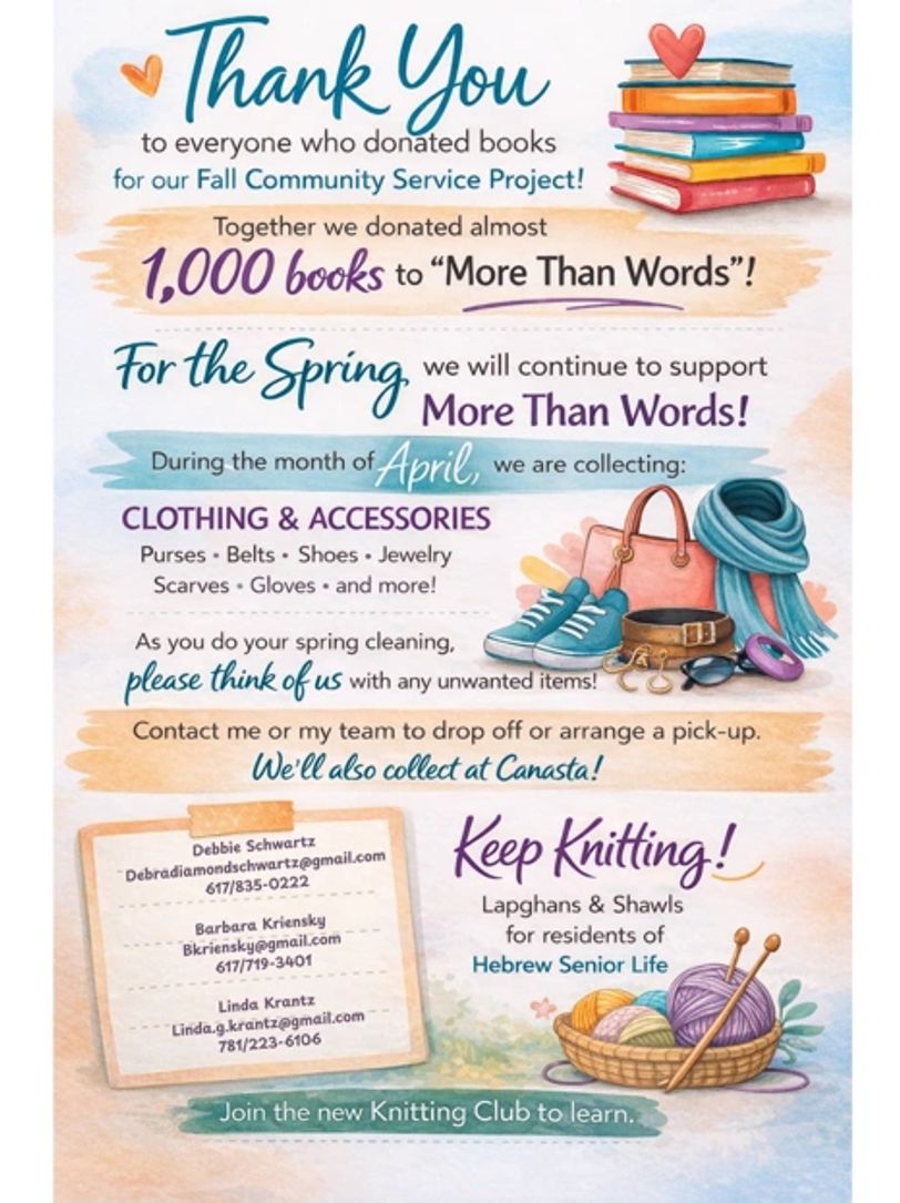 Calling all knitters and crocheters. Please continue to make shawls and lapghans to be donated to elder residents of Hebrew Senior Life in Roslindale, Newbridge on the Charles in Dedham and Orchard Cove in Canton. Save your creations for the fall collection.